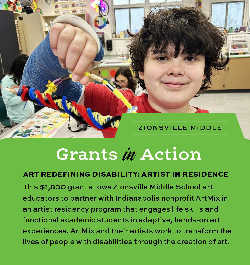 The Zionsville Middle School art educators team of Jen Gibson and Jill Phipps received a recent Fall 2025 Classroom Grant for their project “Art Redefining Disability: Artist in Residence.” This partnership with ZMS art educators and the Indianapolis nonprofit ArtMix artist residency program engages life skills and functional academic students with hands-on art experiences.